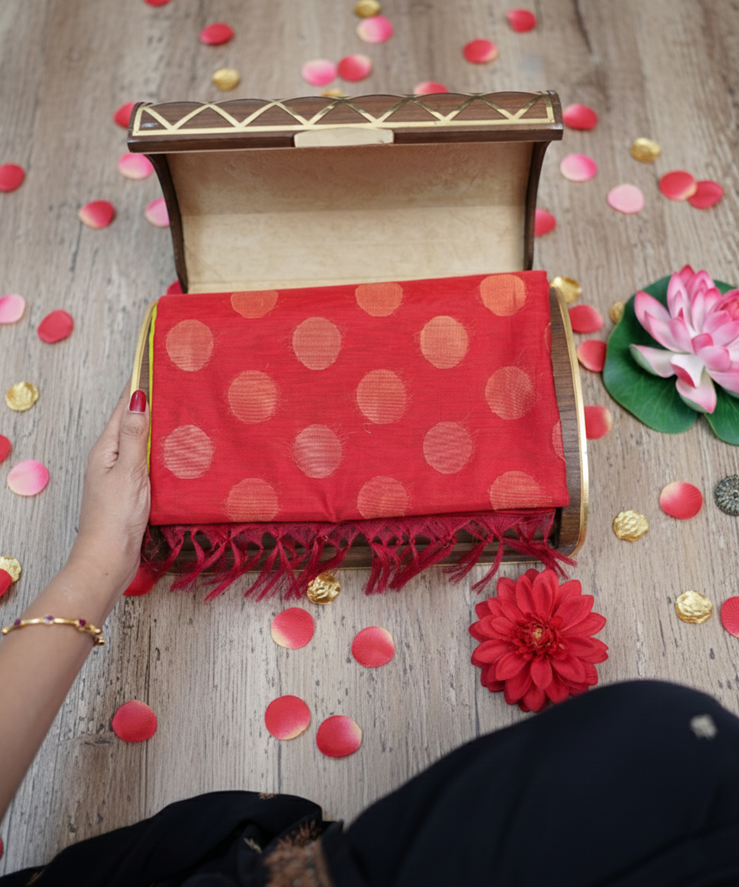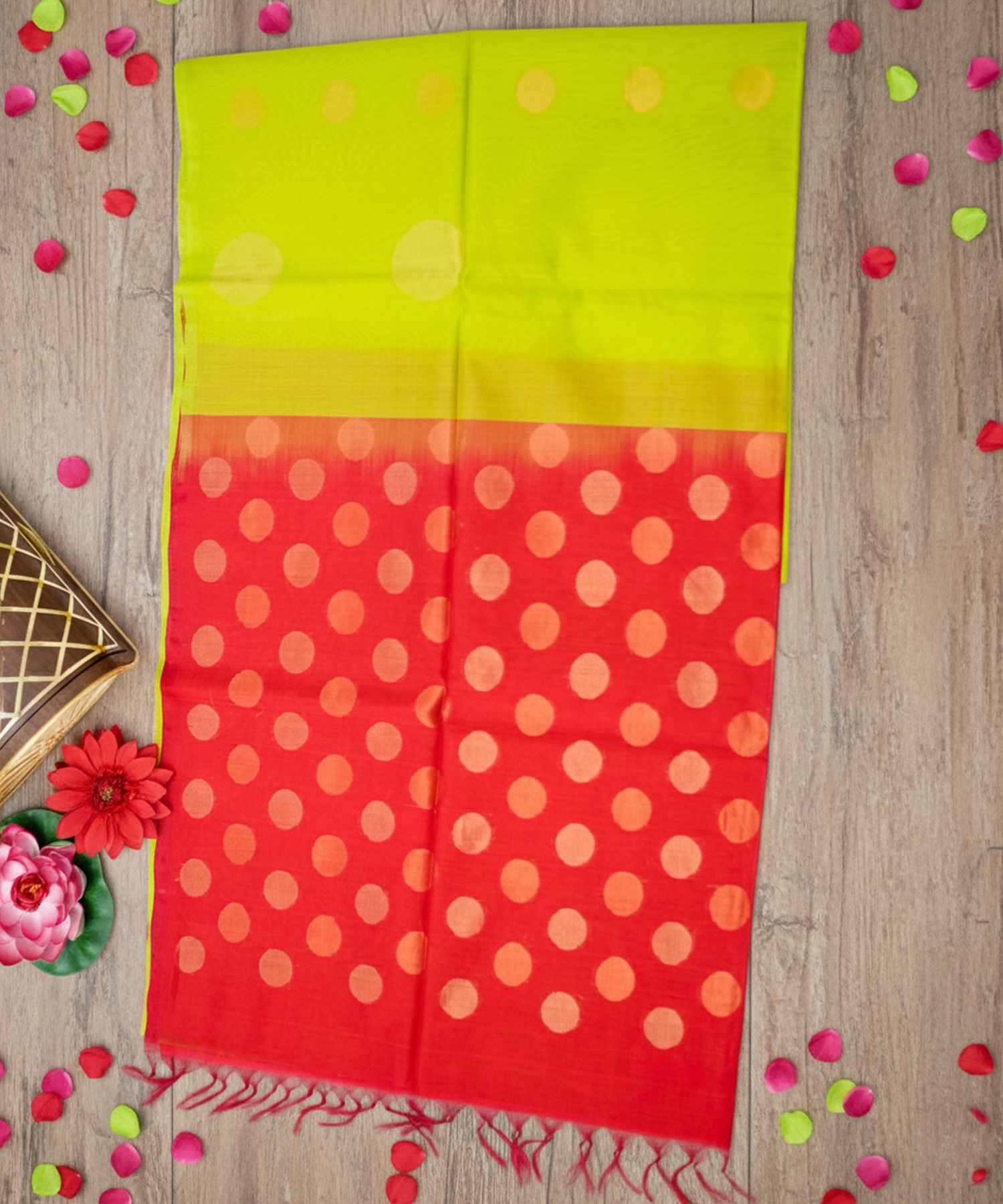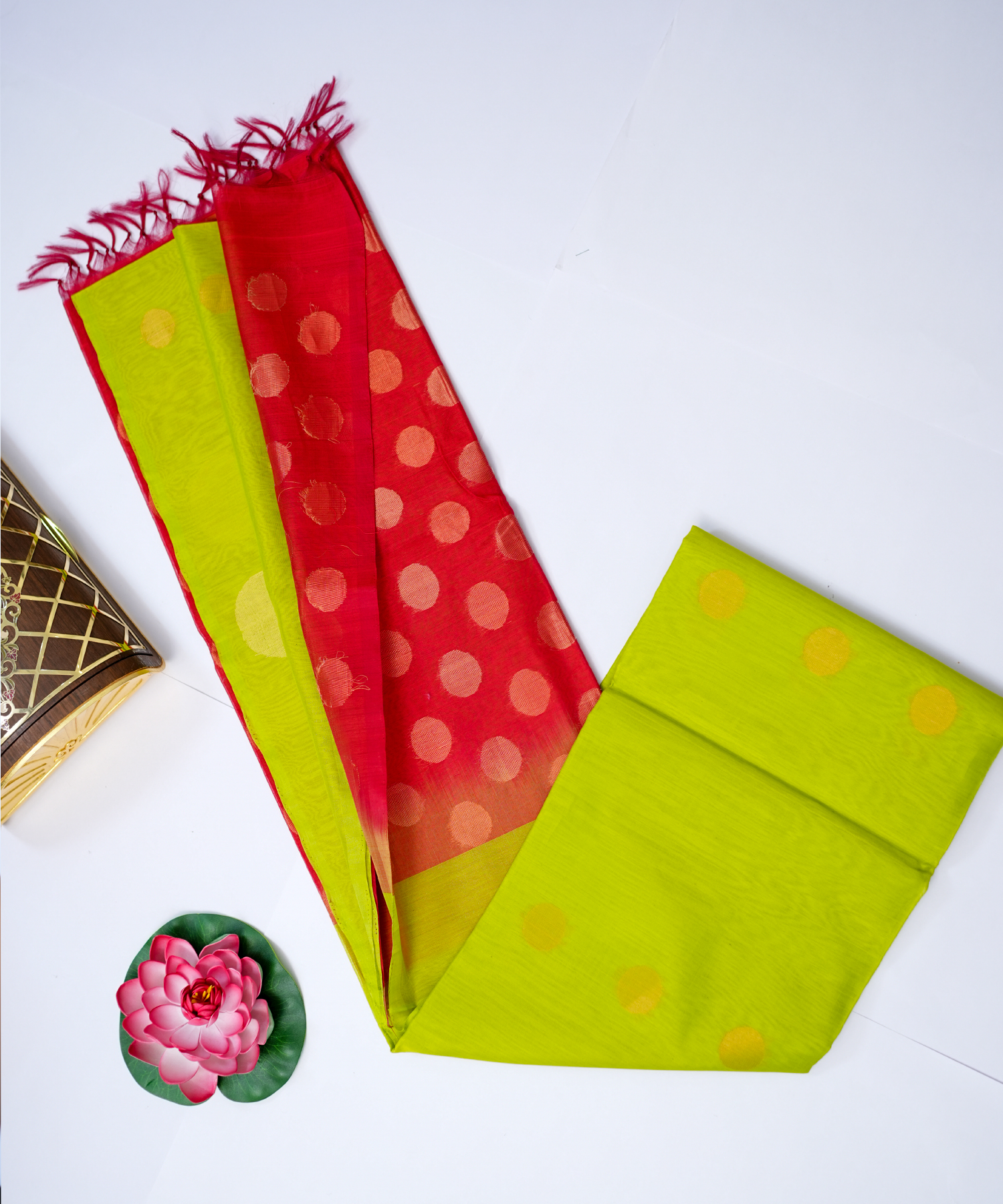 This elegant silk cotton saree features a vibrant combination of lime green and red, highlighted with graceful gold polka motifs that add festive charm. Lightweight yet rich in texture, it drapes beautifully and is perfect for traditional occasions, celebrations, and everyday elegance.