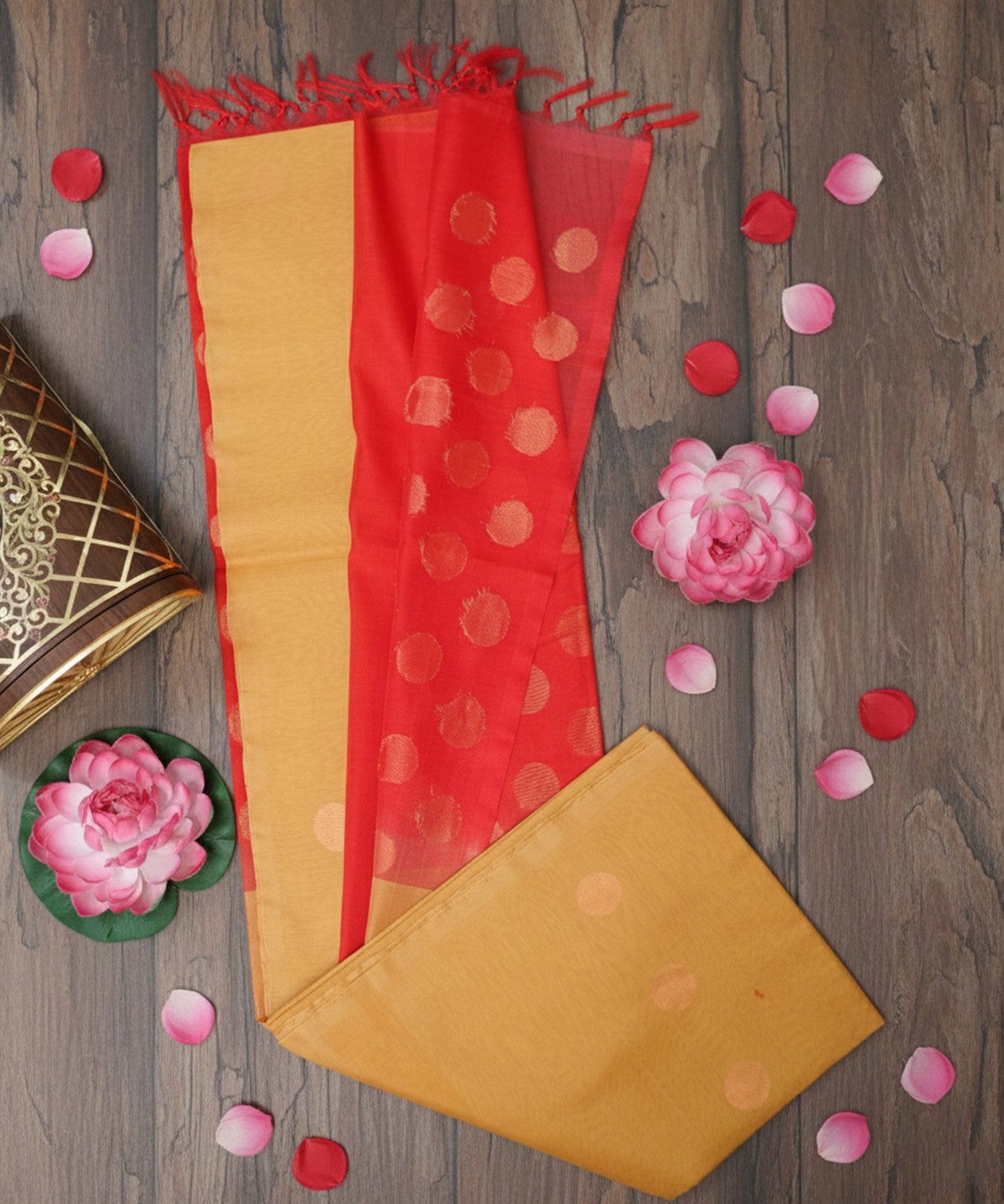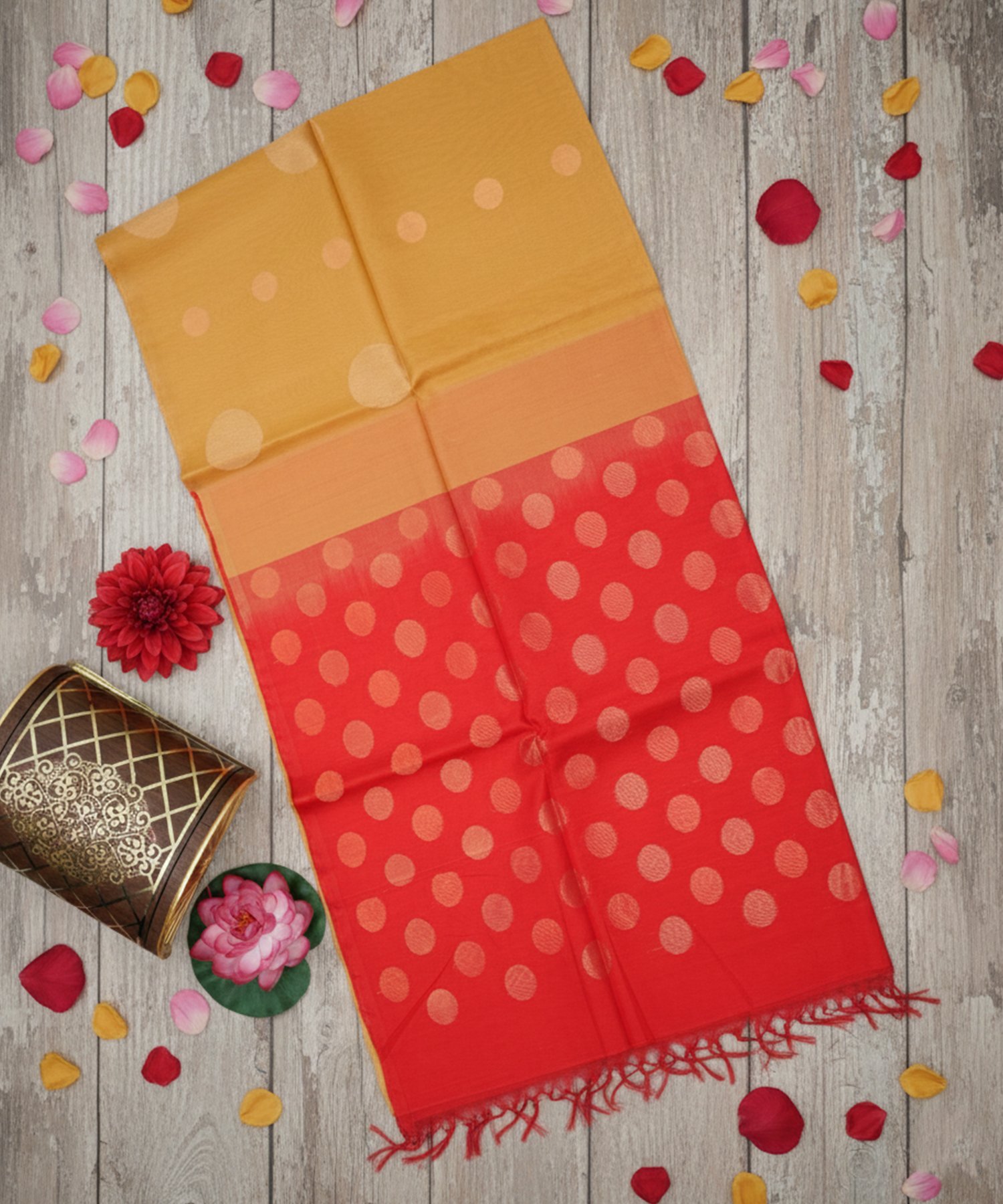 This elegant saree features a vibrant dual-tone design, blending a rich mustard yellow body witha bold crimson red border adorned with classic metallic gold polka dots. Crafted from a high quality cotton-silk blend, it offers a sophisticated sheen and a light weight drape that is perfect for both festive celebrations and formal gatherings.